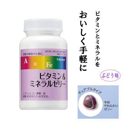 健康にうれしい不足しがちな4つの栄養素、ビタミンA、ビタミンE、葉酸、鉄を配合。ビタミンAと鉄は、3粒で1日の必要摂取量の約1/3補えます。水なしでかんで食べられる、中がやわらかいゼリードロップタイプ。普段の食事のあい間に、お菓子感覚で食べられる、おいしいぶどう味。1日3粒がめやす。3粒で約11kcal。